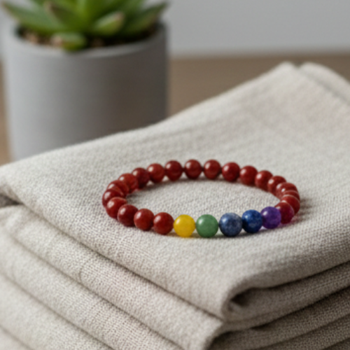 Red Carnelian enhances creativity, confidence, and motivation, while the 7 Chakra stones help balance energy flow and improve communication skills. Together, they promote clarity, self-expression, and inner stability, making this bracelet ideal for personal growth, meditation, and daily wear.